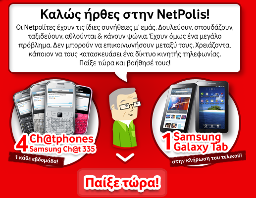 Στο διαγωνισμό Netpolis οι παίκτες έχουν την ευκαιρία να κερδίσουν μέσω κλήρωσης 4 Samsung Ch@t335 (1 κάθε εβδομάδα), ενώ θα υπάρξει και ένας μεγάλος νικητής στο τέλος του διαγωνισμού που θα κερδίσει, μέσω κλήρωσης επίσης, 1 Samsung Galaxy Tab.