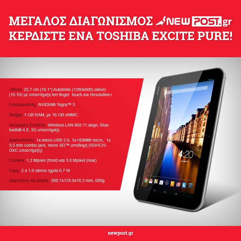 Το Newpost.gr διοργανώνει διαγωνισμό και σας δίνει τη δυνατότητα να κερδίσετε ένα Android tablet Toshiba Excite Pure.