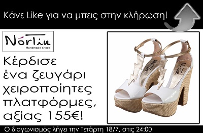 Η σελίδα NorTin Handmade Shoes διοργανώνει διαγωνισμό και σας δίνει τη δυνατότητα να κερδίσετε ένα ζευγάρι χειροποίητες πλατφόρμες αξίας 155€.