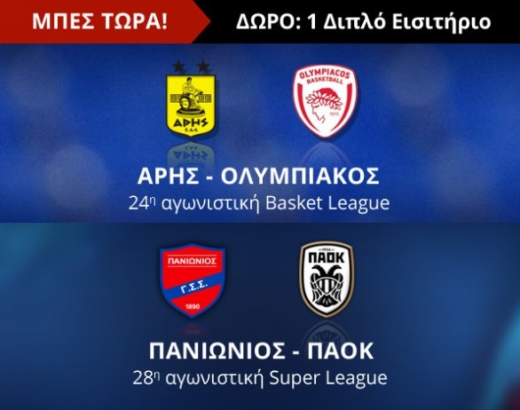 To Novasports.gr διοργανώνει διαγωνισμό και σας δίνει τη δυνατότητα να κερδίσετε ένα διπλό εισιτήριο για τον αγώνα Αρης – Ολυμπιακός και ένα για τον Πανιώνιος – ΠΑΟΚ!