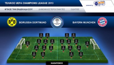 Το novasports.gr σε καλεί να φτιάξεις τις ενδεκάδες του τελικού του Champions League και να κερδίσεις τη φανέλα της νικήτριας ομάδας. Επίλεξε τους παίκτες που θέλεις και σύρε τη φωτογραφίας τους πάνω στο γήπεδο στις προτεινόμενες θέσεις. Χρειάζεται να επιλέξεις όλους τους παίκτες κάθε ομάδας για να μπεις στην κλήρωση.