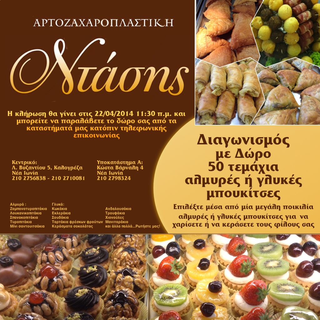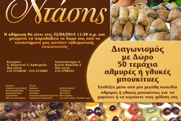 Τα Αρτοζαχαροπλαστεία Ντάσης – ntasis.gr διοργανώνουν διαγωνισμό και σας δίνουν τη δυνατότητα να κερδίσετε 50 τεμ. αλμυρές ή γλυκές μπουκίτσες!