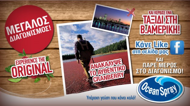 Η σελίδα Ocean Spray Greece διοργανώνει διαγωνισμό και δίνει τη δυνατότητα σε 1 μεγάλο τυχερό νικητή να κερδίσει ένα ταξίδι 2 ατόμων στην πολιτεία της Μασαχουσέτης των Ηνωμένων Πολιτειών Αμερικής, με όλα τα έξοδα πληρωμένα, ενώ 10 ακόμα νικητές θα κερδίσουν προϊόντα Ocean Spray για έναν ολόκληρο χρόνο.