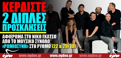 Το Ogdoo.gr εξασφάλισε για τους αναγνώστες του τέσσερις διπλές προσκλήσεις με κρασί ή μπύρα για το αφιέρωμα στο Νίκο Γκάτσο από το μουσικό σύνολο «Ρωμιοσύνη» στο Ρυθμό, στις 22 & 29 Οκτωβρίου 2012.