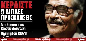Το ogdoo.gr διοργανώνει διαγωνισμό και σας δίνει τη δυνατότητα να κερδίσετε 5 Διπλές Προσκλήσεις για το αφιέρωμα στον Κώστα Μουντάκη την Δευτέρα 30/1/2012 στο Θέτρο Badminton.
