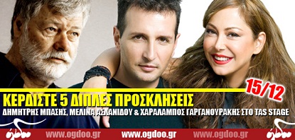 Το Ogdoo.gr εξασφάλισε για τους αναγνώστες του πέντε διπλές προσκλήσεις με ποτό για Δημήτρη Μπάση, Μελίνα Ασλανίδου & Χαράλαμπο Γαργανουράκη στο Tas Stage στις 15 Δεκεμβρίου 2012.