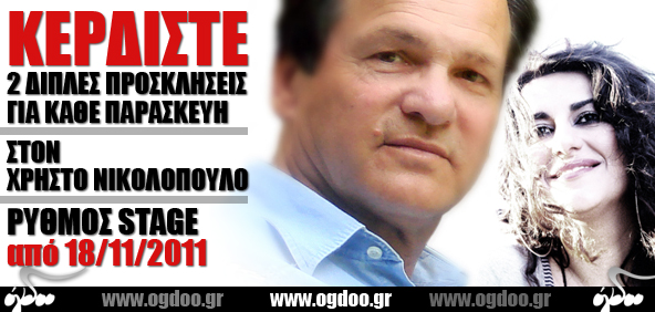 Το Ogdoo.gr εξασφάλισε για τους αναγνώστες του από 2 Διπλές προσκλήσεις για τις παραστάσεις του Χρήστου Νικολόπουλου και της Σοφίας Παπάζογλου στο Ρυθμός Stage ΚΑΘΕ ΠΑΡΑΣΚΕΥΗ για όλη τη διάρκεια των εμφανίσεών τους, αρχής γενομένης από την Παρασκευή 18/11/2011.