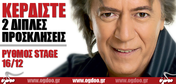 Το ogdoo.gr διοργανώνει διαγωνισμό και σας δίνει τη δυνατότητα να κερδίσετε 2 Διπλές προσκλήσεις για την παράσταση του Κώστα Τουρνά στο Ρυθμός Stage για την Παρασκευή 16/12/2011 και 2 Διπλές προσκλήσεις για την παράσταση του Παναγιώτη Λάλεζα στο Χαμάμ για την Κυριακή 18/12/2011.