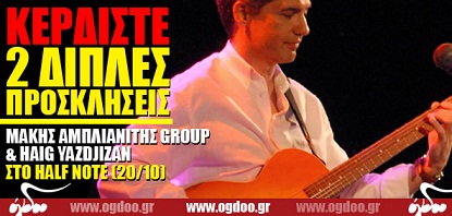 Το Ogdoo.gr εξασφάλισε για τους αναγνώστες του πέντε διπλές προσκλήσεις για τη συναυλία του Μάκη Αμπλιανίτη με τον Haig Yazdjizan στο Half Note Jazz Club, στις 20 Οκτωβρίου 2012.