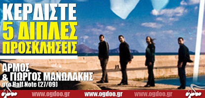 Το Ogdoo.gr εξασφάλισε για τους αναγνώστες του πέντε διπλές προσκλήσεις για τη συναυλία των Αρμός & του Γιώργη Μανωλάκη στο Half Note Jazz Club, στις 27 Σεπτεμβρίου 2012.