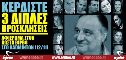 Το Ogdoo.gr εξασφάλισε για τους αναγνώστες του τρεις διπλές προσκλήσεις για το αφιέρωμα στον Κώστα Βίρβο στο Badminton, στις 12 Νοεμβρίου 2012.
