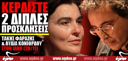 Το Ogdoo.gr εξασφάλισε για τους αναγνώστες του δύο διπλές προσκλήσεις με κρασί ή μπύρα για τη συναυλία του Τάκη Φαραζή με τη Λυδία Κονιόρδου στον Ιανό, στις 20 Νοεμβρίου 2012.