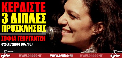 Το Ogdoo.gr εξασφάλισε για τους αναγνώστες του τρεις διπλές προσκλήσεις για τη συναυλία της Σοφίας Γεωργαντζή στο Χυτήριο, στις 06 Οκτωβρίου 2012.