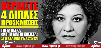 Το Ogdoo.gr εξασφάλισε για τους αναγνώστες του τέσσερις διπλές προσκλήσεις για τη Γιώτα Νέγκα στη Χελώνα στις 17 & 24 Δεκεμβρίου 2012.
