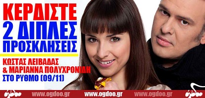 Το Ogdoo.gr εξασφάλισε για τους αναγνώστες του δύο διπλές προσκλήσεις με κρασί ή μπύρα για την εμφάνιση του Κώστα Λειβαδά με την Μαριάντα Πολυχρονίδη στο Ρυθμό, στις 09 Νοεμβρίου 2012.