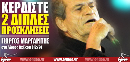 Το Ogdoo.gr εξασφάλισε για τους αναγνώστες του δύο διπλές προσκλήσεις για τη μεγάλη συναυλία του Γιώργου Μαργαρίτη στο Άλσος Βεΐκου, στις 12 Σεπτεμβρίου 2012.