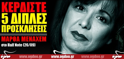 Το Ogdoo.gr εξασφάλισε για τους αναγνώστες του πέντε διπλές προσκλήσεις για τη συναυλία της Μάρθας Μεναχέμ με τη Μυρτώ Ναούμ & τον Μιχάλη Κωτσογιάννη στο Half Note Jazz Club, στις 26 Σεπτεμβρίου 2012.