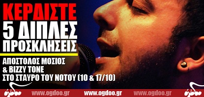 Το Ogdoo.gr εξασφάλισε για τους αναγνώστες του πέντε διπλές προσκλήσεις με κρασί ή μπύρα ανά συναυλία του Απόστολου Μόσιου & των Bizzy Tone στο Σταυρό του Νότου Club, στις 10 & 17 Οκτωβρίου 2012.