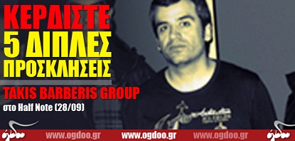 Το Ogdoo.gr εξασφάλισε για τους αναγνώστες του πέντε διπλές προσκλήσεις για τη συναυλία του Τάκη Μπαρμπέρη στο Half Note Jazz Club, στις 28 Σεπτεμβρίου 2012.