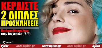 Το Ogdoo.gr εξασφάλισε για τους αναγνώστες του δύο διπλές προσκλήσεις για τη συναυλία της Νατάσσας Μποφίλιου στην Τεχνόπολη, την Τετάρτη 05 Σεπτεμβρίου 2012.