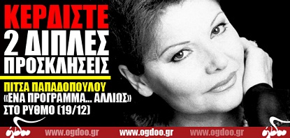 Το Ogdoo.gr εξασφάλισε για τους αναγνώστες του δύο διπλές προσκλήσεις με ποτό για την εμφάνιση της Πίτσας Παπαδοπούλου με τον Κώστα Μάντζιο στο Ρυθμό στις 19 Δεκεμβρίου 2012.