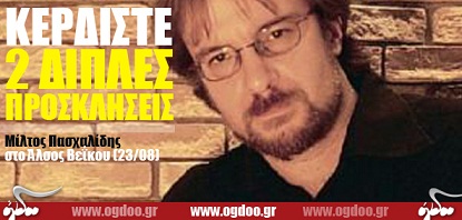 Το Ogdoo.gr εξασφάλισε για τους αναγνώστες του δύο διπλές προσκλήσεις για τη συναυλία του Μίλτου Πασχαλίδη, στο Άλσος Βεΐκου, στις 23 Αυγούστου.
