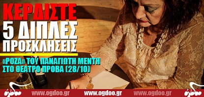 Το Ogdoo.gr εξασφάλισε για τους αναγνώστες του πέντε διπλές προσκλήσεις για τη θεατρική παράσταση «Ρόζα Εσκενάζυ» του Παναγιώτη Μέντη στο Θέατρο Πρόβα, στις 28 Οκτωβρίου 2012.