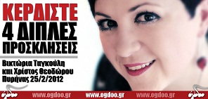 Το Ogdoo.gr εξασφάλισε για τους αναγνώστες του Τέσσερις (4) Διπλές Προσκλήσεις για την τελευταία εμφάνιση των Ταγκούλη – Θεοδώρου στον Πυρήνα το Σάββατο 25/2/2012.