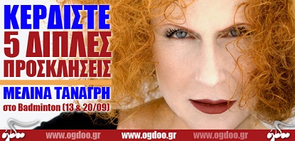 Το Ogdoo.gr εξασφάλισε για τους αναγνώστες του από πέντε διπλές προσκλήσεις για τις συναυλίες της Μελίνας Τανάγρη στο Μουσικό Προαύλιο του Badminton, στις 13 & 20 Σεπτεμβρίου 2012.