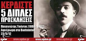 Το Ogdoo.gr εξασφάλισε για τους αναγνώστες του 5 διπλές προσκλήσεις για την παράσταση – αφιέρωμα στον Παναγιώτη Τούντα στο Θέατρο Badminton την Τετάρτη 23/5/2012.