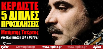 Το Ogdoo.gr εξασφάλισε για τους αναγνώστες του από πέντε διπλές προσκλήσεις για τις συναυλίες του Μπάμπη Τσέρτου στο Μουσικό Προαύλιο του Badminton, στις 7 & 8 Σεπτεμβρίου 2012.