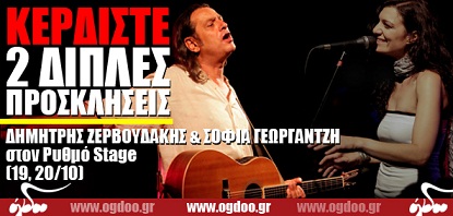 Το Ogdoo.gr εξασφάλισε για τους αναγνώστες του δύο διπλές προσκλήσεις με ποτό ή κρασί για τις δύο πρώτες εμφανίσεις του Δημήτρη Ζερβουδάκη με τη Σοφία Γεωργαντζή στο Ρυθμός Stage, στις 19 & 20 Οκτωβρίου 2012.