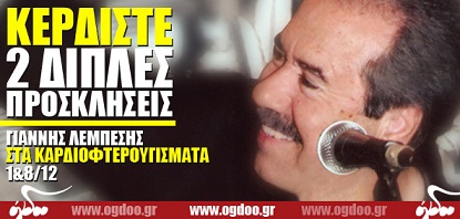 Το Ogdoo.gr εξασφάλισε για τους αναγνώστες του δύο τραπέζια τεσσάρων ατόμων με πλήρες μενού και απεριόριστο κρασί στα Καρδιοφτερουγίσματα, όπου εμφανίζεται ο Γιάννης Λεμπέσης, τα Σάββατα 01 & 08 Δεκεμβρίου 2012.