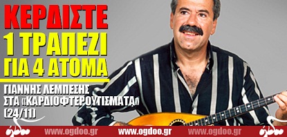 Το Ogdoo.gr εξασφάλισε για έναν ακόμα τυχερό αναγνώστη ένα τραπέζι με πλήρες μενού κι απεριόριστο κρασί για τέσσερα άτομα στα Καρδιοφτερουγίσματα, όπου εμφανίζεται ο Γιάννης Λεμπέσης, το Σάββατο 24 Νοεμβρίου 2012.