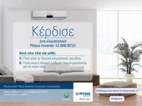 Η σελίδα Οικιακές Συσκευές Pitsos διοργανώνει διαγωνισμό και σας δίνει τη δυνατότητα να κερδίσετε 1 κλιματιστικό Pitsos 12.000 btu (εσωτερική μονάδα: P1ZAI1250W / εξωτερική μονάδα: P1ZAO1250W).