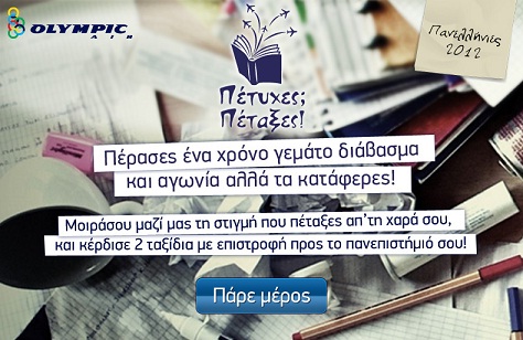 Η Olympic Air διοργανώνει το διαγωνισμό «Πέτυχες; Πέταξες!» και δίνει τη δυνατότητα σε 10 τυχερούς να κερδίσουν από 2 αεροπορικά εισιτήρια (συμπεριλαμβανομένων των φόρων αεροδρομίου) με την Olympic Air προς επιλεγμένο προορισμό, μετ’ επιστροφής.