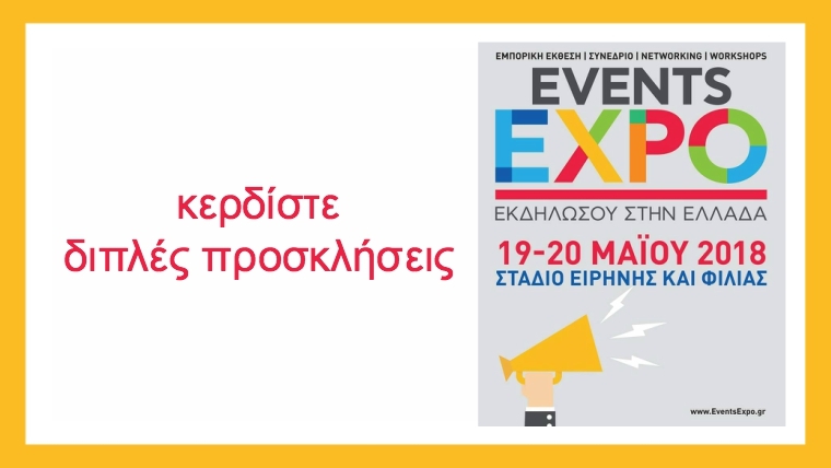 Η σελίδα Όμορφη Ζωή διοργανώνει διαγωνισμό και σας δίνει τη δυνατότητα να κερδίσετε 5 διπλές προσκλήσεις για το Events Expo 2018 όπου θα υπάρχει εμπορική έκθεση, εταιρικές παρουσιάσεις, workshops και εργαστήρια διασύνδεσης, έτσι ώστε να γνωρίσετε καλύτερα την αγορά και τις νέες τάσεις σε προϊόντα, εξοπλισμό και υπηρεσίες!