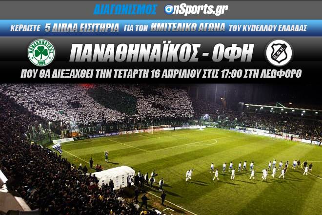Το onsports.gr διοργανώνει διαγωνισμό και σας δίνει τη δυνατότητα να κερδίσετε 5 διπλά εισιτήρια για τον αγώνα Παναθηναϊκός – ΟΦΗ την Τετάρτη 16 Απριλίου και ώρα 17:00 το απόγευμα στη Λεωφόρο για τον δεύτερο ημιτελικό αγώνα του Κυπέλλου Ελλάδας.