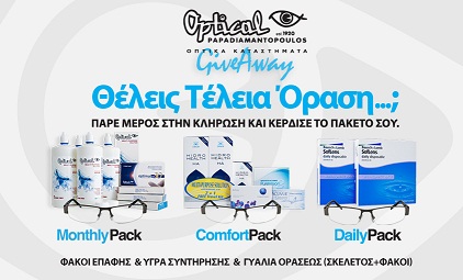 Τα οπτικά καταστήματα Optical Papadiamantopoulos η πρώτη αλυσίδα οπτικών που εφάρμοσε τους φακούς επαφής στην Ελλάδα προσφέρουν σε δύο τυχερούς από ένα ολοκληρωμένο πακέτο όρασης [φακοί επαφής + υγρά συντήρησης + γυαλιά οράσεως (σκελετός + φακοί)] που θα επιλέξουν οι ίδιοι.