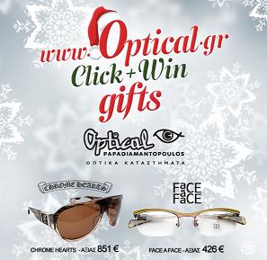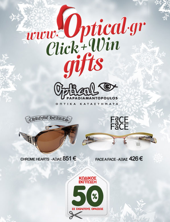 Τα οπτικά καταστήματα Optical Papadiamantopoulos σας εύχονται καλά Χριστούγεννα και σας χαρίζουν πολύτιμα δώρα και προνόμια..! Μπείτε στο www.optical.gr συμπληρώστε τα στοιχειά σας και πάρτε μέρος στη κλήρωση για δυο μοναδικούς χειροποίητους σκελετούς, 1 ζευγάρι γυαλιά ήλιου chromε hearts άξιας 851€ και 1 σκελετό οράσεως face a face άξιας 426€.