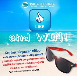 Η σελίδα OPTIKA-FAKOI EPAFIS FOTIS PAPOULIAS διοργανώνει διαγωνισμό και σας δίνει τη δυνατότητα να κερδίσετε 30 γυαλιά ηλίου την εβδομάδα.