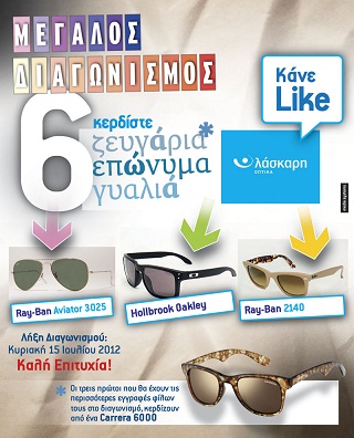 Τα Οπτικά Λάσκαρη διοργανώνουν διαγωνισμό και σας δίνουν τη δυνατότητα να κερδίσετε 6 ζευγάρια γυαλιά ηλίου. Τα δώρα είναι τρία ζευγάρια γυαλιά μετά από κλήρωση και τρία ζευγάρια γυαλιά για τους τρεις πρώτους που θα έχουν τις περισσότερες εγγραφές φίλων τους στο διαγωνισμό.