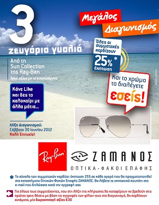 Η σελίδα Οπτικά Ζαμάνος διοργανώνει διαγωνισμό και σας δίνει τη δυνατότητα να κερδίσετε 3 ζευγάρια γυαλιά Rayban Aviator.