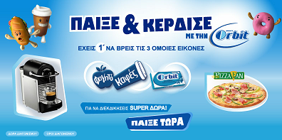 Η σελίδα Orbit Gum Greece διοργανώνει διαγωνισμό και σας δίνει τη δυνατότητα να κερδίσετε 4 Καφετέριες Delonghi Nespresso Pixie EN 125 και 140 Πίτσες Pizza Fan (Μεγάλο Μέγεθος) της επιλογής των τυχερών ως δώρα στιγμιαίας νίκης (Instant win).
