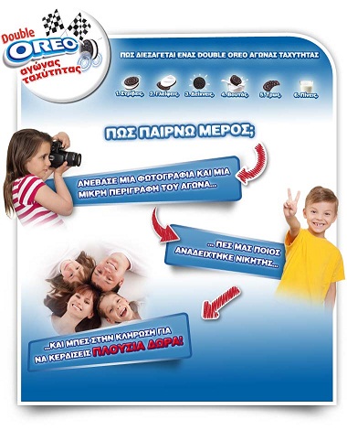 Τα μπισκότα Oreo διοργανώνουν διαγωνισμό και σας δίνουν τη δυνατότητα να κερδίσετε 5 πακέτα δωρεάν οικογενειακών διακοπών στην Ελλάδα (επιλογή από Σαντορίνη, Χανιά, Πάρος, Ρόδος, Νάξος, Λευκάδα, Κέρκυρα, Χαλκιδική), 5 εβδομαδιαία προγράμματα στην αθλητική παιδική κατασκήνωση Sport Camp στο Λουτράκι για παιδιά 6-14 ετών, 30 Sony PSP και μαζί το παιχνίδι CARS και 100 διπλά εισιτήρια για τα ODEON Cinemas.