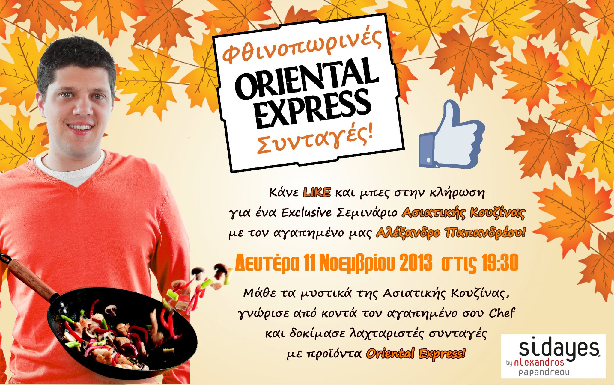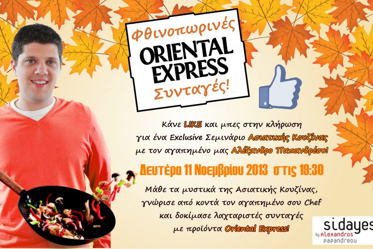 Η σελίδα orientalexpress.eu διοργανώνει διαγωνισμό και σας δίνει τη δυνατότητα να κερδίσετε μια θέση στο Exclusive Σεμινάριο Ασιατικής Κουζίνας με Chef τον αγαπημένο μας Αλέξανδρο Παπανδρέου!