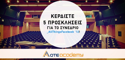 Η σελίδα OTEAcademy διοργανώνει διαγωνισμό και σας δίνει τη δυνατότητα να κερδίσετε 5 προσκλήσεις για το συνέδριο AllThingsFacebook 2012. Μάθετε τα πάντα για το Facebook Marketing και το συναρπαστικό κόσμο των Social Media, στις σύγχρονες εγκαταστάσεις της OTEAcademy.