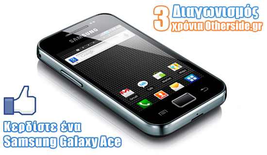 To Otherside.gr γιορτάζει τα 3 χρόνια λειτουργίας του διοργανώνοντας διαγωνισμό και σας δίνει την ευκαιρία να κερδίσετε ένα κινητό τηλέφωνο Samsung Galaxy Ace!