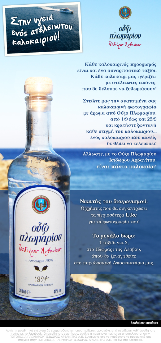 To Ούζο Πλωμαρίου διοργανώνει διαγωνισμό στο facebook και σας δίνει τη δυνατότητα να κερδίσετε 1 ταξίδι για 2 άτομα στο Πλωμάρι της Λέσβου, όπου θα ξεναγηθείτε στο παραδοσιακό αποστακτήριο