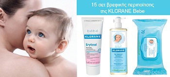 Το paidimag.gr σε συνεργασία με την Klorane προσφέρουν σε 30 τυχερούς: 15 σετ βρεφικής περιποίησης (Ένα Αφρόλουτρο 2 σε 1 για σώμα και μαλλιά Gel douceur chv/corps, μια Κρέμα για το ερύθημα και αλλαγή πάνας Eryteal και μια συσκευασία 75 τεμαχίων με μωρομάντιλα Lingettes nettoyants) και 15 σετ για την περιποίηση της μαμάς (Ο νέος καινοτόμος ορός για αδυνάτισμα και μείωση της κυτταρίτιδας από την 7η ημέρα Cellu slim της Elancyl, ένα Dry shampoo για καθαρά μαλλιά στη στιγμή και μια κρέμα νυκτός από τη σειρά Nectalys της Galenic για κάθε τύπο δέρματος για ενυδάτωση και λείανση των πρώτων ρυτίδων και λεπτών γραμμών).